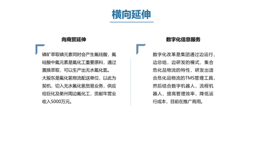 依托磷化工与新能源行业发展契机,聚焦细分领域深耕细作,围绕上下游物流运营,延伸运输、配送、商贸等多种业务,推进磷化工行业大循环物流模式创新,打破传统危化品运输单一介质单程放空的难题,实现运营效率提升和经营收益增长,成为了磷化工物流行业领头企业。